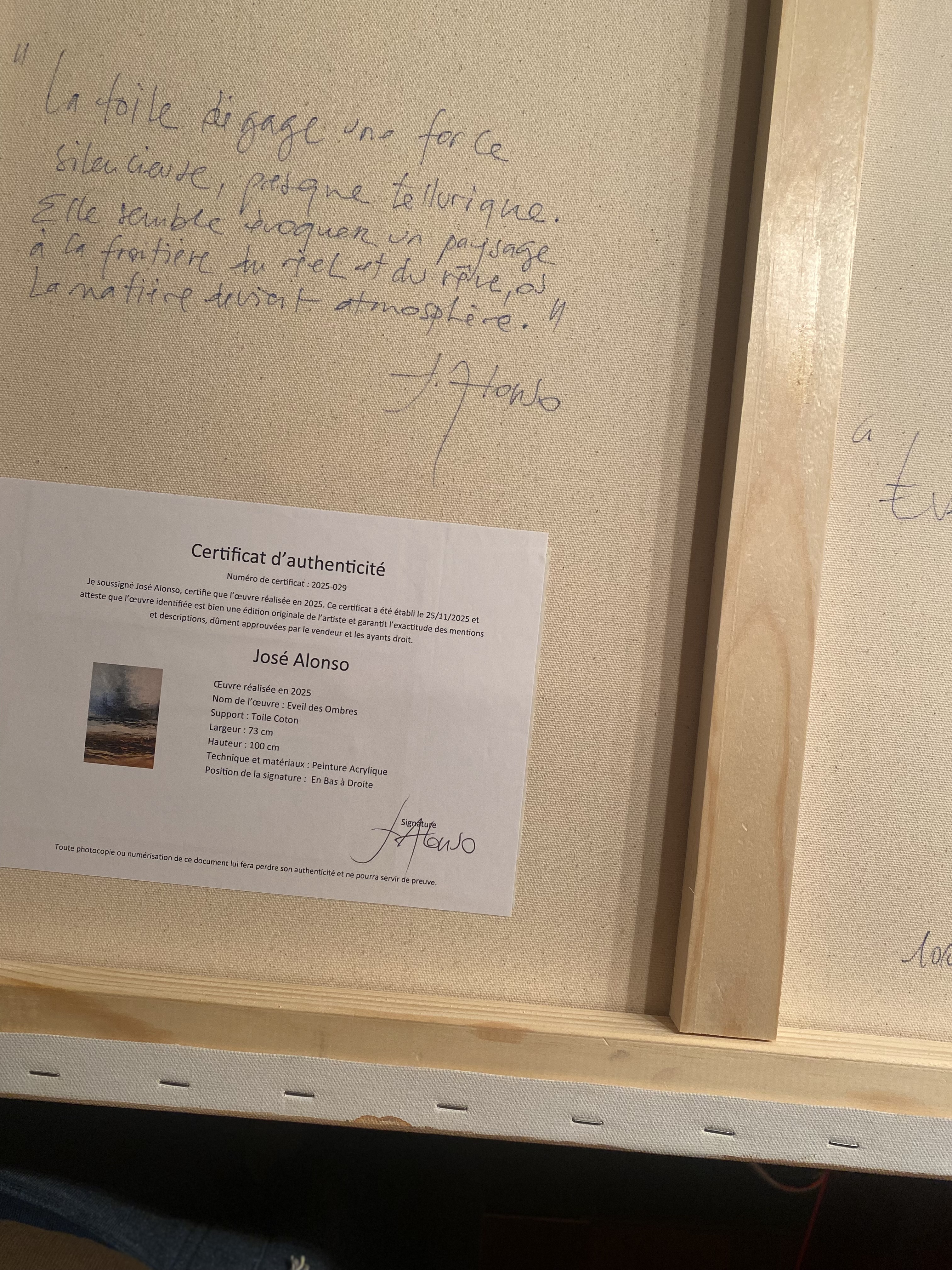 Toutes les œuvres sont vendues avec une facture et un certificat d'authenticité. Le certificat constitue la "carte d'identité" de l'œuvre et vous garantit une création unique et originale.