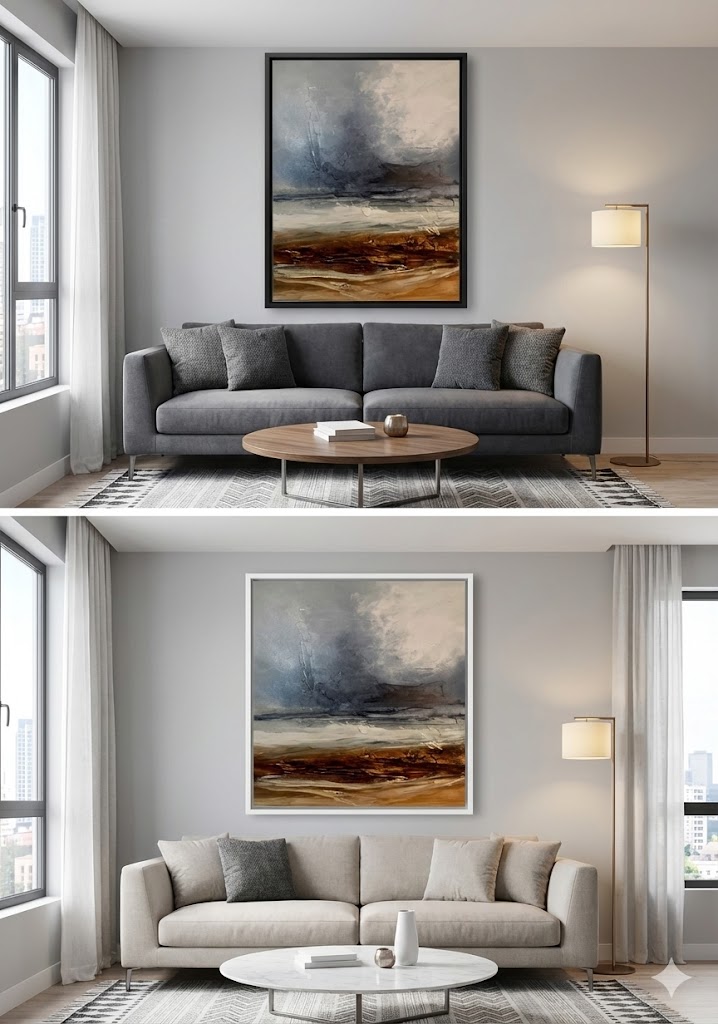 Les textures épaisses racontent la mémoire d’un sol ancien, tandis que les voiles de gris, plus légers, évoquent une présence diffuse — une respiration du monde avant l’aube.